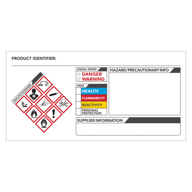 Mysteries of HazCom Labels Solved- KHA Online-SDS Management There are six required elements for a fully compliant GHS label including: Product Identifier Signal Word Pictograms Hazard Statements Precautionary Statements Supplier Information Below is an example of a GHS-compliant label which includes each of the six required elements listed above.